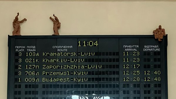 На платформі вокзалу у Львові з’явилися твори мистецтва людей, що зустрічаються, і пар, що очікують, під назвою "Радість". Це інсталяція митця Дениса Шиманського.